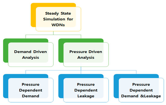 PDA can be divided into PDD analysis, PDL analysis and PDDL analysis depending on whether the water pressure-dependent factors are considered as suppliable demand, leakage quantity or both factors (Figure 1). The description of each analysis method is as follows.