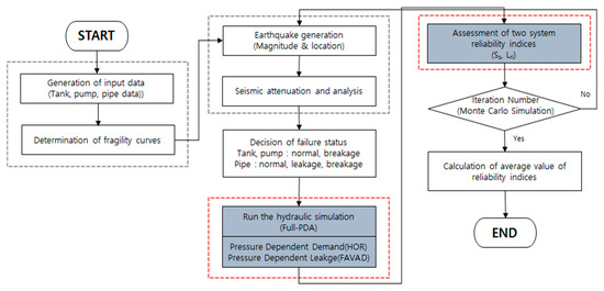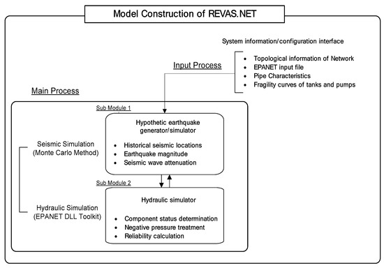 Yoo et al. [11,12] presented a seismic reliability evaluation tool for water supply systems called REVAS.NET (Reliability EVAluation model of earthquake hazard for water supply network). It quantifies the water supply serviceability through a series of processes of earthquake occurrence and attenuation, the determination of component (pipe, tank and pump) failure conditions and failure modeling based on hydraulic simulations. The running procedure and model construction of REVAS.NET are as shown in Figure 2. The detailed procedures can be found in Yoo et al. [11,12]. In this paper, only those parts that are related to the differences between the proposed methods are presented.