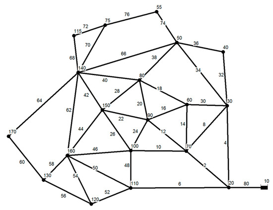 The proposed method is applied to Anytown Network (Figure 4), a well-known benchmark network in the field of waterworks pipe networks (Yoo et al [25]). Anytown Network is a pipe network presented first by Walski et al. [37]. Jung et al. [38] modified this pipe network and used for pipe design to minimize the total cost and maximize system robustness. The pipe originally connected to two water distribution reservoirs was removed and a fixed head was formed so that water is supplied from a single reservoir. Through the foregoing, the head of a fixed water source is heightened from 3 m (10 ft) to 73.2 m (240 ft). The demand required by the entire system is 1113 LPS(liter per second), 17,640 GPM(gallon per minute) and the total length of the pipe is 81,382 m (267,000 ft). The demander’s ground heights are distributed in a range from 6 to 37 m (20 to 120 ft) and the pipe diameters are composed of 152–762 mm (6~30 inch).