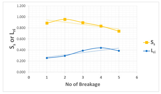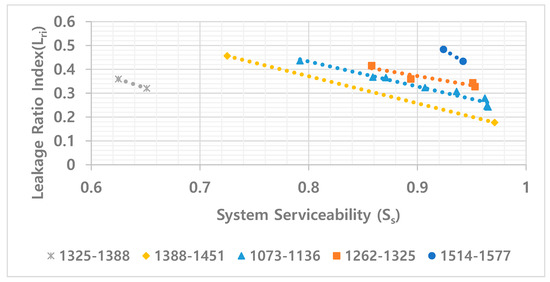 Figure 5 shows the results of the two indices proposed in the present study drawn as a diagram on a plane. In general, when the value of Ss increases, the value of Lri is expected to decrease in inverse proportion. However, the inverse proportionality as such can occur when the final supply flow rate is fixed at a constant level and the result cannot be identified when all the indicators of all scenarios have been shown in a diagram because the final supply flow rates by scenario vary greatly between 1073 and 1703 LPS (17,000 and 27,000 GPM). Figure 5 shows the resultant values of two indicators of the scenario in which the supply (outflow) corresponds to 1325 to 1388 LPS (21,000 to 22,000 GPM) among the earthquake scenarios. It can be identified that as Ss increased, the tendency of decreases in Lri appears clearly.