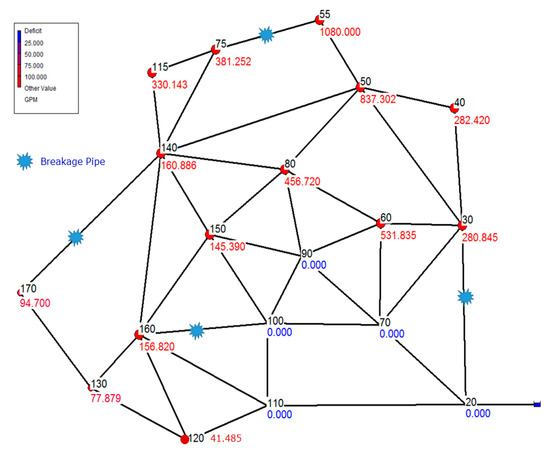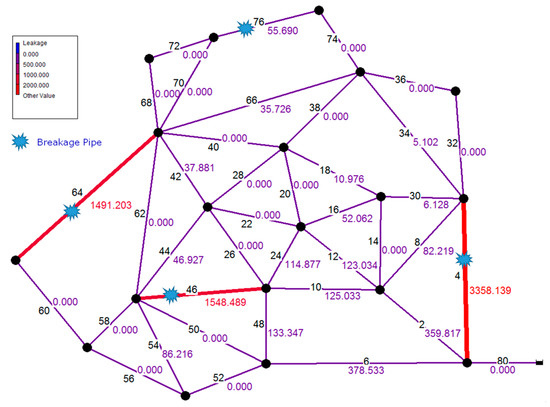 Since the coefficient proposed by Lambert et al. [32] is a value for calculating the leakage quantity of the entire pipe network system, while the leakage quantities of individual pipes are separately calculated in the present study, C1 and C2 values were set appropriately considering the water pressure distribution and the number of pipes in the target pipe network. Since the purpose of the present study is to derive reliability evaluation results through PDA and compare the relevant results with the results of the model of REVAS.NET, in this study, the C1, C2 values of normal, leakage and breakage states were appropriately assumed for analysis. In this paper, C1 and C2 values of normal, leakage and breakage states are properly assumed. When actually applied later, since FAVAD coefficients have uncertainty, in cases where reference C1, C2 values can be set through the measurement of the minimum flow rate at night, the relevant values should be used. Therefore, in this model, the value of C1 was set to 0.0001 and the value of C2 was set to 0.000005. In the case of breakage, the values of 0.001 and 0.0001 were entered respectively to analyze the results.