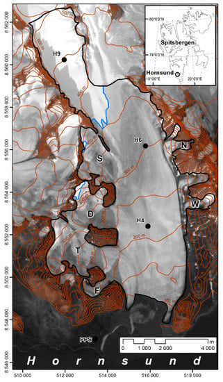 The long-term (1989–2011) average winter accumulation of 0.97 m w.e. (water equivalent) is insufficient to compensate for mass loss due to surface ablation (−1.26 m w.e.), resulting in a negative net surface balance of −0.28 m w.e. []. The average altitude of the equilibrium line is 370 m a.s.l. (varying between 316–427 m a.s.l. over the studied period), deviating towards lower elevations on the western side of Hansbreen and depending on the asymmetry of the snow depth field []. Glacier dynamics vary in terms of space and time. Surface velocity increases towards the calving front, from 55–70 m year−1 near stake H4 [] to over 230 m year−1 at the front in late summer 2009 []. Speed-up events are observed during episodes of liquid precipitation or intense surface ablation [].