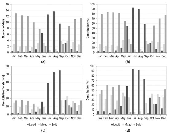 Annual course of liquid, solid, and mixed precipitation at Hornsund meteorological station (1979–2017): (a) number of days with precipitation, (b) contribution of precipitation forms to monthly number of days with precipitation, (c) precipitation totals, and (d) contribution of precipitation forms to monthly precipitation totals.