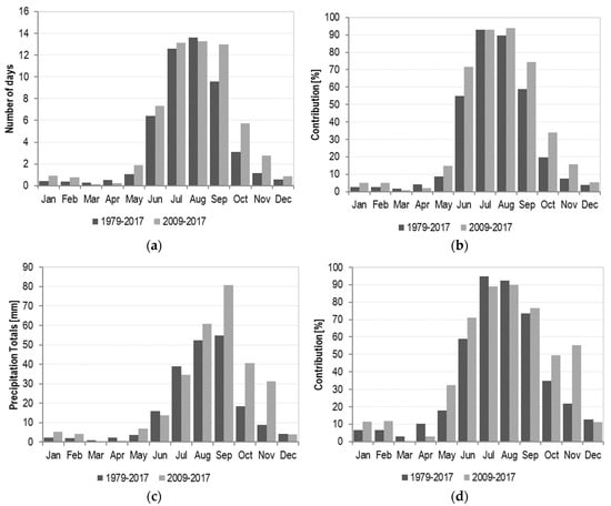 Monthly values of liquid precipitation characteristics in the 1979–2017 (dark bars) and 2009–2017 (light bars) periods: (a) number of days with liquid precipitation, (b) contribution of liquid precipitation to overall number of days with precipitation, (c) liquid precipitation totals, and (d) contribution of liquid precipitation to the overall precipitation totals.