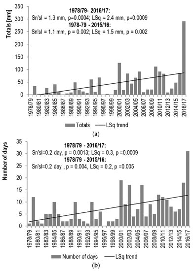 Winter rain totals and frequency in Oct‒Mar have significantly increased since 2000 (Figure 4). The average total of winter rain calculated from the 2000/2001–2016/2017 seasons was 72.1 mm, whereas it had reached 18.9 mm during the previous 17-year-long period, 1983/1984–1999/2000. The analogous averages for the number of days with winter rain were 12 (2000/2001–2016/2017) and four days (1983/1984–1999/2000). Differences in the means of total and frequency of winter rain between the periods 1979/1980–1999/2000 and 2000/2001–2016/2017 were also statistically significant at p = 0.002 for totals and p = 0.040 for frequency, as shown by the permutation sampling method enabling the comparison of the series of various lengths [,]. Both parametric and non-parametric trends in the frequency of winter rain totals were positive and statistically significant. Sen’s slope and the related Mann–Kendall tests indicated increases of 1.3 mm a year, significant at p = 0.0005, for winter rain totals and of 0.2 day a year, significant at p = 0.0013, for the number of days with winter rain. Trend magnitudes for the entire research period were influenced by very high values in the 2016/2017 season. In order to eliminate this effect, we also calculated trends for the period 1978/1979–2015/2016 that proved significant increase in winter rain frequency and totals (Figure 4). Part of this increase was fictitious due to the larger part of liquid phase caught by the rain gauges []. However, significant decrease in the annual fraction of solid precipitation, indicating rain increase was also found at other Svalbard stations and Jan Mayen [,,]. Moreover, climate models project future dramatic increase in the entire Arctic rainfall due to melting solid precipitation driven by local air temperature trends [].