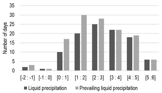 We identified 104 days with winter rain between October and May in the seasons from 2009/2010 to 2016/2017. We also examined all days with mixed precipitation to identify those with the greatest precipitation totals due to rain according to the criterion that the occurrence of snowfall may be recorded within one observational term (at most) for current weather or two observational terms for past weather. We identified 22 such days, with precipitation ranging from 1.7 to 24 mm. Finally we selected 126 days with rain or dominant rain in the analyzed period. The seasonal (Oct–May) winter rain totals varied significantly from year to year, reaching 19 mm in 2012/2013 and as much as 321 mm in 2016/2017 (Figure 5). Implementation of the correction factor against measurement error increased the accumulated winter rain totals by 146 mm (976–1123 mm) for the entire analyzed period.