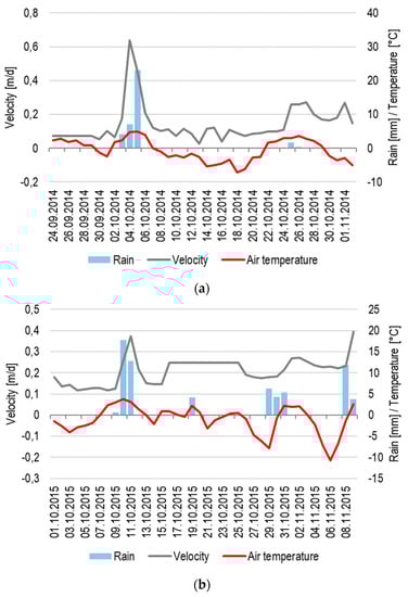 Reaction of glacier dynamics to rainfall events differs during subsequent winters. The average surface velocity in early winter between October and December was 0.18 and 0.24 m day−1 in 2014 and 2015, respectively. Some of the speed-up events before snow accumulation seasons started must have been related to rainfall, since they occurred on days with liquid precipitation or shortly afterwards. On the 4th and 5th of October 2014, following rain events with intensities of 7 and 23 mm per day, accordingly, the velocity of the glacier front was six times the base speed of ca 0.08 m day−1 noted just before and after the speed-up event, and almost three times the base speed as of the last quarter of 2014. Prior to snow accumulation in winter 2015, two events of accelerated front movement related to liquid precipitation were recorded. The first occurred on the 11th of October, the second between the 9th and 12th November, with both reaching 0.4 m day−1, 1.5 times the average velocity for Oct–Dec. The speed-up events were linked to the intense winter rain that occurred on the 10th (17.8 mm) and 11th (12.8 mm) October and on 8th of November (11.9 mm) (Figure 6).