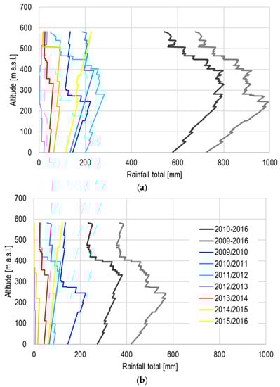 Spatial distribution of cumulated winter rain totals (mm) between October and May 2009–2016 for: (a) whole period, and (b) when winter rain occurred following snow accumulation.