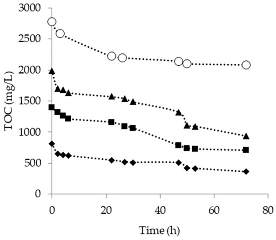 Total organic carbon (TOC) removal trends during the aerobic treatment of pyrolysis wastewater at 30 °C (TOC initial concentration: (♦) 800 mg/L, (■) 1400 mg/L, (▲) 2000 mg/L and (○) 2800 mg/L).