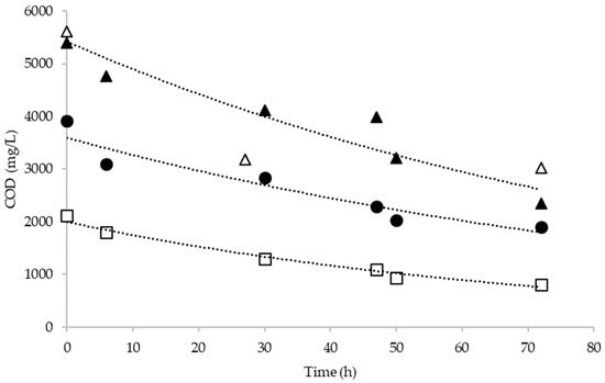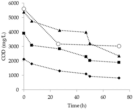 Chemical oxygen demand (COD) removal trends during the aerobic treatment of pyrolysis wastewater at 30 °C (TOC initial concentration: (♦) 800 mg/L, (■) 1400 mg/L, (▲) 2000 mg/L and (○) 2800 mg/L).