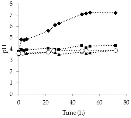 pH evolution during the aerobic treatment of pyrolysis wastewater at 30 °C (TOC initial concentration: (♦) 800 mg/L, (■) 1400 mg/L, (▲) 2000 mg/L and (○) 2800 mg/L).