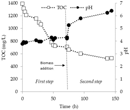 Acidic conditions were observed during the 72 h of treatment in all the tests, except at the low TOC initial value (800 mg/L), where neutral condition (pH equal to 7.2) were achieved after 27 h (Figure 3). This result suggests that in the case of low TOC values a faster degradation occurred, with the mineralization of acidic compounds, thus resulting in a quick increase of pH. On the basis of the above results and in view of the implementation of a biological step for the treatment of pyrolysis wastewater, a pretreatment depending upon organics concentration could be required to reduce initial organics concentration to a suitable range for bacterial degradation. To this aim an additional test of bioaugmentation was carried out: 1400 mg/L was considered as optimal value for the biological treatment of pyrolysis water. After the first 72 h treatment a new amount of biomass (5 mL) was added by driving the test for further 72 h. A further degradation (from 72–144 h) was interpreted from the initial TOC 1400 mg/L at 30 °C, and resulted in a degradation of TOC of 61.80%, after 144 h (Figure 4).