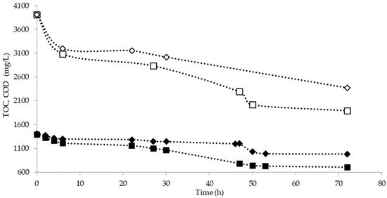 In the tests performed at pH = 7, a 30.12% TOC removal and 39.40% COD removal were observed. Comparing these values to the corresponding values obtained in the tests performed at uncontrolled pH (49.47% TOC removal and 51.54% COD removal), it was possible to confirm that neutral pH compromised the microbial metabolism reducing process effectiveness (Figure 5). This effect also suggests that the acclimation of microorganism under acidic pH conditions could result in a process enhancement and prevent process inhibition under acidic conditions [26,27].
