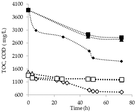 In regards to the influence of temperature on the degradation rate, tests at 15 °C, 25 °C and 30 °C were performed at 1400 mg/L, initial TOC value and at uncontrolled pH. The results of TOC and COD removal yields are reported in Figure 6.
