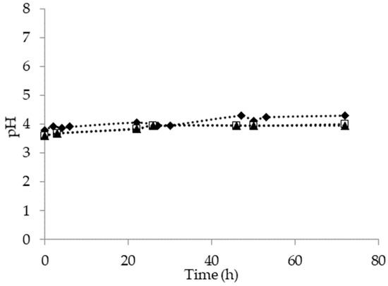 pH evolution during the aerobic biological treatment of pyrolysis wastewater at 15 °C (triangle), 25 °C (square) and 30 °C (rhomboid).