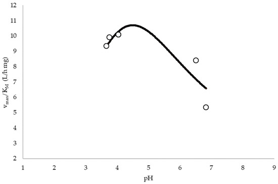 where va is the fitted kinetic parameter, veff is the ‘pH-corrected’ parameter, [H+] is the hydrogen-ion concentration and KI and KII are the ions dissociation constants. Similar results obtained for phenolic compounds in another study [26] proved the pH-stability of enzymes and the dissociation pathways in the same optimal pH range of 5–6.