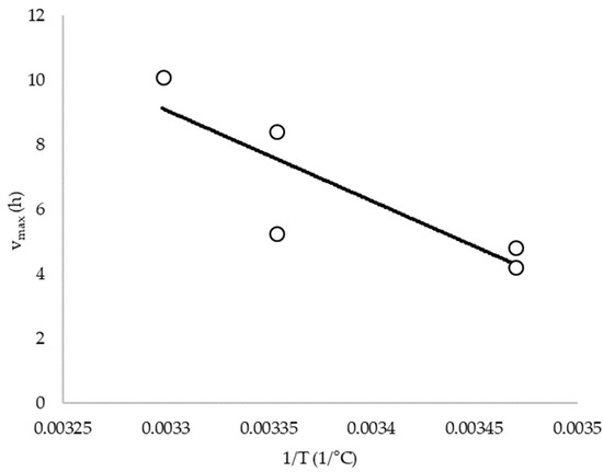 Finally, the temperature effect on kinetic parameters is reported as linear regression of (va) vs. (1/T), as shown in Figure 10.