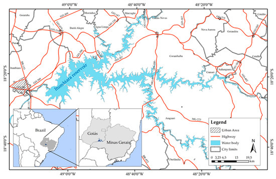 The study area covers the large tropical reservoir of the Itumbiara Dam (with a water surface area of 778 km²), a South American earth-filled dam that is located between two Brazilian cities, Itumbiara-GO and Araporã-MG (Figure 1), standing along the Paranaíba River. This embankment dam lies between latitude 18°24’27" S and longitude 49°5’53" W and is the 14th largest hydroelectric power plant reservoir in a water surface area and 12th in installed capacity (i.e., 2082 MW) [31] in Brazil.