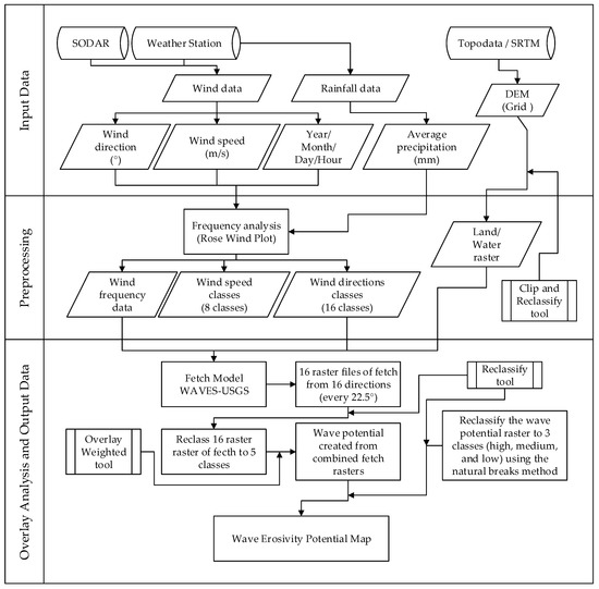 The shoreline erosive potential was evaluated based on the previous work of Olson and Ventura [29] that used a wave fetch model to estimate the wave potential generate by wind. This GIS-based model produces a wave potential raster of the combined effects of the fetch and wind data on inland lake shores. The wind data had several wind direction frequencies of occurrence that were weighted to produce a fetch raster. The wave potential of the Itumbiara Dam reservoir was obtained following three main procedures, as follows: input data, preprocessing and geospatial analyses (overlay analysis and output data). Input data includes wind data from two different anemometers, precipitation data, and the land raster. Preprocessing involves the statistical analysis of the wind behavior and suitability of the digital terrain model. All the geospatial data were analyzed using the geoprocessing tools in ArcGIS 10.3 (v.10.3, ESRI, Redlands, CA, USA). Finally, the overlay analysis and output of data used tools in a GIS platform to elaborate the final model of wave erosivity. Figure 2 shows the flowchart of the main procedures of this study that determined the Shoreline Erosivity Potential map.