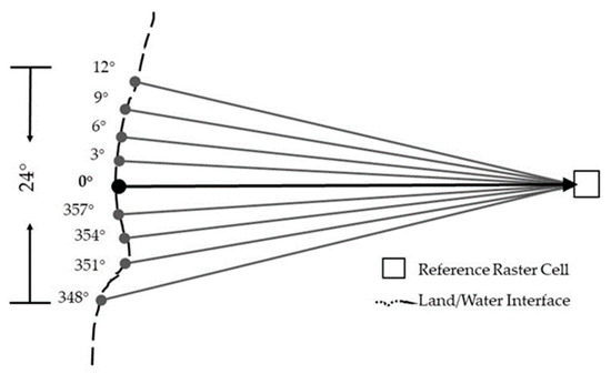 The fetches are estimated for 16 wind directions from the wind data and the reclassified land raster. This analysis was performed according to the method of the Shore Protection Manual (SPM), which calculates the arithmetic mean of the fetch lengths for each raster cell, spreading nine radials around the principal wind direction at 3° increments, forming a 24°-arc. In general, this larger arc represents a more realistic condition for shoreline evaluation. The wind-fetch model ignores any near-shore processes [20]. Figure 3 shows the SPM schematic.
