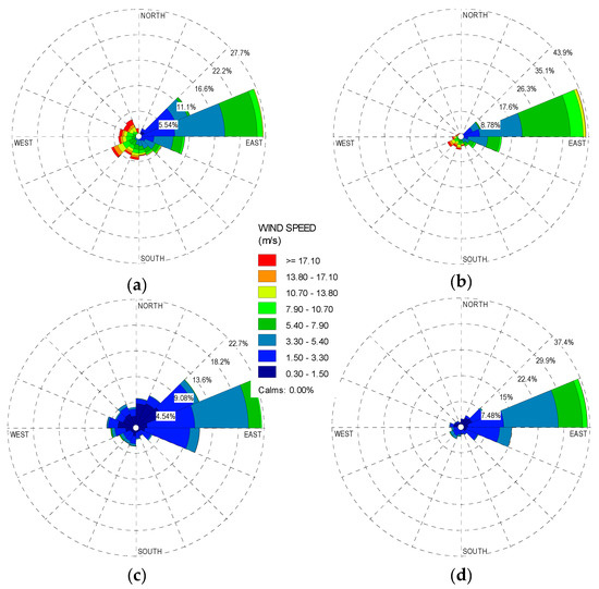The wind rose plots, separated by rainy (a) and dry (b) seasons of SODAR, and rainy (c) and dry (d) seasons for the weather station.
