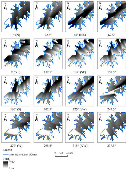 After the wind rose plot analyses, the original land raster (DEM) was modified with a new single file including a water body and shoreline at an elevation of 520 m. This raster file only has the objective of representing the interface between the land and water. Therefore, after preprocessing the input data, this study proceeds with the WAVES tool applications. A high-resolution land raster dataset allows a better definition of islands and shore boundaries. However, increasing the spatial resolution of land rasters requires more processing time. In the case of the Itumbiara reservoir, at least 12 hours were needed to calculate 16 fetches from the data with the 30-m spatial resolution.