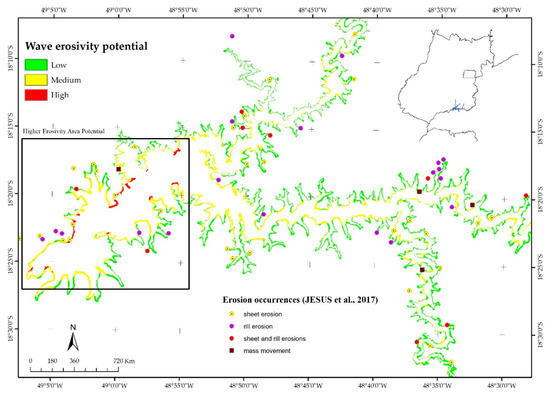In addition, this wave erosivity potential was generated for both wind data obtained from the SODAR sensor and the weather station. The comparison between these maps presented very similar values. Only the map generated by the wind sound profiler data (i.e., the Doppler sensor) is illustrated in this paper and presented in Figure 7, which covers almost the entire Itumbiara reservoir. It is a small-scale map (i.e., 1:250.000) and indicates the area with the highest occurrence of highly erosive wave potential. This map also presents the occurrences of water erosion processes, mapped by field visits and satellite image analysis, according to Jesus et al. [37]. The erosion occurrence illustrated in Figure 7 includes sheet erosion, rill erosion and the association of those erosions, and mass movement. Some sheet erosion-mapped sites coincide with high shoreline wave erosion.