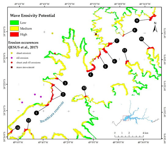 A wave erosivity potential map was created by a new reclassified image of the wave potential using the natural breaks classification method in three classes: low, medium and high. In addition, the shoreline wave erosivity potential was compared with the Itumbiara soil erosion susceptibility (i.e., the sheet and rill erosions) from the work of Romão and Souza [33] and Jesus et al. [38].