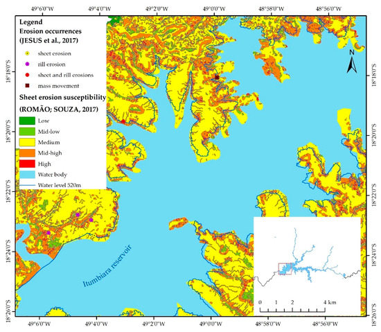 Soil erosion susceptibility of the Itumbiara reservoir with field erosion occurrences.