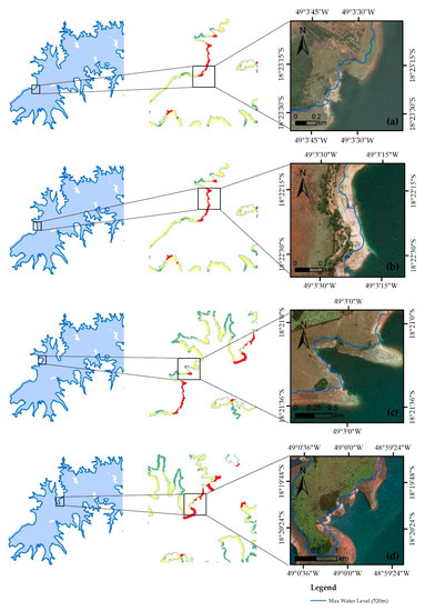 Satellite imagery of the shoreline of erosion sites that have a direct relationship with high values of wave erosivity potential. (a) Area 1. (b) Area 2. (c) Area 3. (d) Area 4.