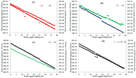 In order to investigate the impacts of water level conditions at downstream boundaries on the nexuses of water supply-water environmental capacity, the water levels were assumed to increase by 0.5 m. The nexuses under rising water levels at the downstream boundaries are shown in Figure 6. Figure 6a–e shows the nexuses under the conditions of rising water levels at the downstream boundaries and different upstream boundary conditions, as set out in Table 1. Figure 6a–e indicates that water environmental capacities increase with rising water level, as shown in the right sides of y-axis values. The water environmental capacity of an increasing 0.5 m water level is bigger than the original downstream water level conditions. As the freshwater in the upstream boundary became nonstationary (increasing or decreasing), the amount of water supply fluctuated. However, the water environmental capacity was impacted by the designed water flow at the upstream boundary, and by the water levels at the downstream boundary. As there is an increasing trend of designed water flow under nonstationary conditions, and the water levels at the downstream boundary are rising from the sea level, the water environmental capacity will increase. The water supply-water environment nexus in a saltwater intrusion area is impacted by both the upstream boundary water inflow and downstream boundary water level conditions. The fluctuated water inflow and the rising sea level are the two primary factors for the nexus of water supply and the pollutant control sectors.