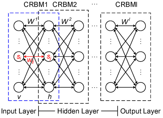 In Figure 1, a typical CDBN model is stacked by using l CRBMs, which present an input or visible layer, an output layer, and l−1 hidden layers. Here, Wl represents the weight matrix of the layers l and l−1. A typical CRBM model is marked by blue dashed lines in Figure 1, which is constructed from a hidden layer h and a visible layer v. Symmetric connections of the weight matrix exist between the two layers, but no such connections are present within a layer.