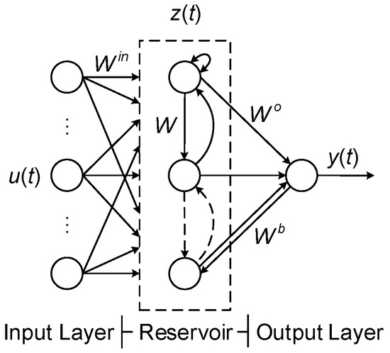 where and are the activation functions of the reservoir and output, respectively. In this study, is selected as the hyperbolic tangent, and is the identity function.