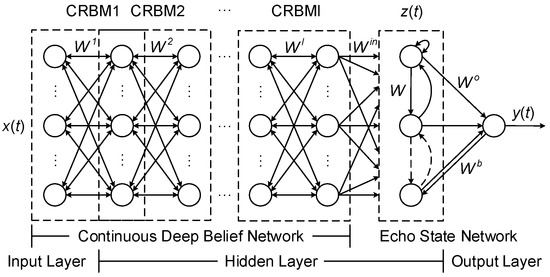 The CDBN and ESN models are integrated to construct a new deep architecture CDBESN model for the prediction of hourly urban water demand. The structure of the CDBESN model is shown in Figure 3. The model consists of a CDBN with l CRBMs in the bottom layer and ESN in the top layer. Accordingly, the learning process of the CDBESN model includes two stages: feature extraction and regression.