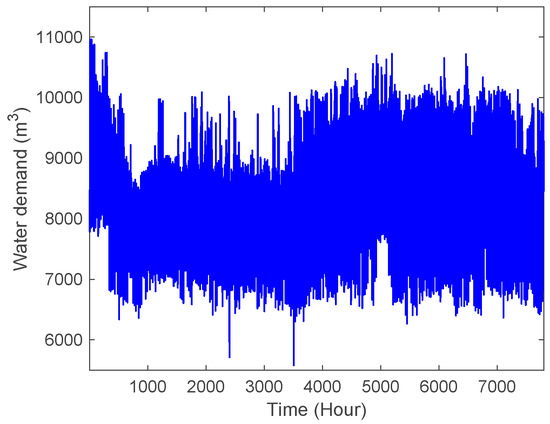 In this study, 7800 hourly water demand data were collected from an urban waterworks of Zhuzhou, China from 1 January 2016 to 21 November 2016. The waterworks has a capacity of 15,000 m3/h, and supplies water to about 600,000 urban residents and factories in that region with an area of about 500 km2. The original hourly water demand data were divided into two parts: 84% of the data (the first 6552 hourly data, from 1 January 2016 to 30 September 2016) were used to train the CDBESN model, and the remaining 16% were applied for the testing dataset. Figure 4 shows the original hourly water demand records obtained from the urban waterworks.
