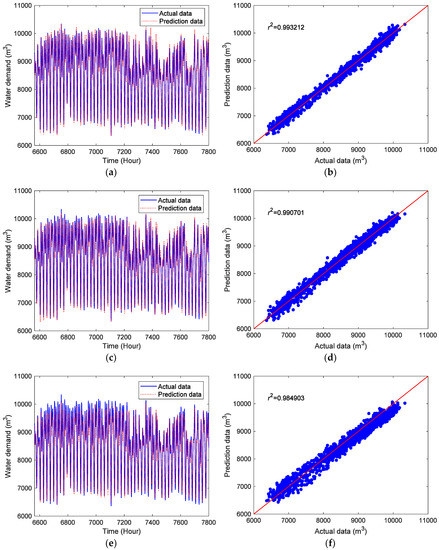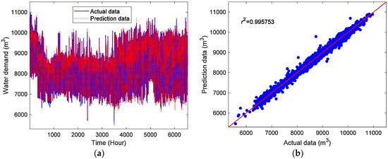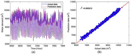 Figure 5 depicts the prediction results of the hourly water demand data by the proposed CDBESN model in the training stage. As shown in the Figure 5a, the prediction data can accurately follow the changes of the actual hourly water demand data. Figure 5b plots the correlations between the prediction data and the actual data for the training data. Evidently, the prediction data are in good agreement with the actual data. Figure 6 presents the forecasting results of the proposed CDBESN in the testing stage. Figure 6a shows the periodicity and trends of the prediction and actual hourly water demand data are successfully matched. As displayed in Figure 6b, the correlations between the prediction data and the actual data in the testing stage show good agreement. This match further confirms that the CDBESN model has a satisfactory feature extraction ability and prediction performance. The three performance indexes of the CDBESN for the hourly water demand prediction in the testing stage are r2 = 0.995912, NRMSE = 0.027163, and MAPE = 2.469419.