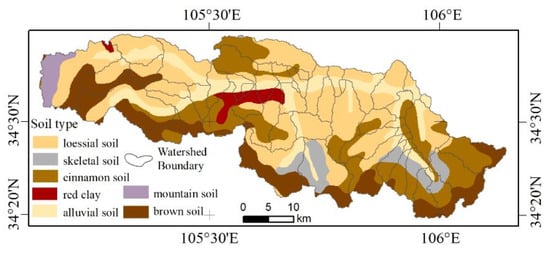 Xihe River is a first-class tributary of the upper and middle reaches of Weihe River. It is located at the northern foothill of Qinling Mountains and the southern edge of Longxi Loess Plateau. It rises at the eastern foot of Jingdongliang Mountain in Longtai Mountain, Tianshui City, Gansu Province, and joins the Weihe River at the Beidaobu gateway in Maiji District. The whole length of the river is 85 km, the area of the basin is 1267 km2, the altitude is 1013~2715 m, and the geographical range is between 34°20′ N ~ 34°38′ N and 105°07′ E ~ 106°00′ E. It belongs to the third sub-region of the Loess Hilly-gully region. The terrain of the basin is fragmented and complex with crisscrossing ravines and gullies, and the terrain is high in the northwest and low in the southeast. The overview of the Xihe River Basin is shown in Figure 1. The Xihe River Basin belongs to a sub-humid climate in the warm temperate zone. Its annual average temperature is 10.5 °C and annual precipitation is 558.9 mm. The precipitation varies greatly between years, distributes unevenly during the year, and takes place mainly in July–September. The spatial distribution of precipitation is as follows: the south is significantly larger than the north with no obvious difference between the east and the west. The soil types are complex and the spatial distribution of soil types in the Xihe River Basin is shown in Figure 2. The main types are loessial soil (accounting for 35.9%), cinnamon soil (accounting for 21.5%), and brown soil (accounting for 19.1%). The loessial soil is mainly distributed in gully, which is 1100–1500 m above sea level. The soil is thick, crisp, and easily be water-eroded in case of heavy rain. The cinnamon soil is mainly distributed in the area of 1500–2100 m above sea level in Qinling Mountain. The brown soil is mainly distributed in the southwest with an altitude of 1500 m–2500 m. The main vegetation is deciduous broad-leaved forest in warm temperate zone, which is in the transition zone from forest grassland to grassland. The natural shrub grassland is mainly distributed in the loess beam and the lower hills, with a coverage rate of 33.05%. This basin has severe soil erosion because of long-term unreasonable reclamation.