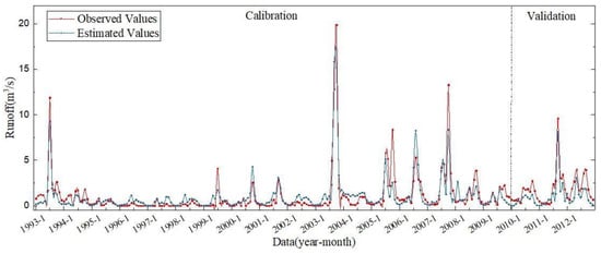 The monthly runoff simulation values of Tianshui Station in the calibration period (1993–2009) and verification period (2010–2012) were obtained after several parameter adjustments. A comparison between the observed runoff values and the simulated runoff values of Tianshui Station (1993–2012) is shown in Figure 3.