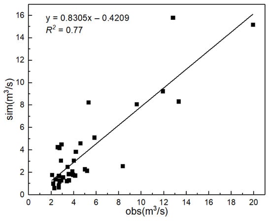 The accuracy of the simulated calibration results was evaluated using 35 peak flow results occurring during the study period: in the calibration period, R2 is 0.81 and ENS is 0.81; in the validation period, R2 is 0.88 and ENS is 0.65; in the peak simulation period (as shown in Figure 4), R2 is 0.77 and ENS is 0.65. These results indicate that the simulation performance of the model for the flood peak period of the river basin is not as accurate as the flat-water period, but the overall simulation results are accurate during the study period. These values indicate that the model has a strong applicability to the Xihe River Basin and well reflects the hydrological conditions of the basin. It provides a data basis for further exploring the spatial variabilities between the runoff erosion capacity and underlying surface conditions in the basin.