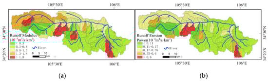 Spatial distribution of annual average runoff modulus (a) and annual average runoff erosion power (b) in Xihe River basin.