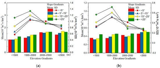 Based on the elevation of the river basin ranging from 1013 to 2715 m, 545 HRUs were grouped based on elevation gradients as < 1500 m, 1500~2000 m, 2000~2500 m, and > 2500 m; and grouped based on slope gradients as <5°, 5~15°, 15~25°, and >25°. The Mean and Standard Deviation (SD) of runoff modulus and runoff erosion power based on the hydrological response unit were calculated and shown in Figure 6.