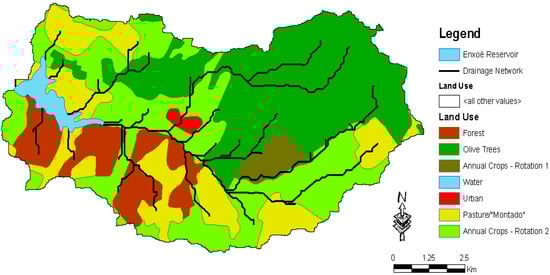 The climate in the region is dry sub-humid to semi-arid. The annual average precipitation is 500 mm, irregularly distributed throughout the year (80% of the annual precipitation is concentrated between October and April). The slopes are gentle, with the river showing an average slope of approximately 2%, while the catchment has an average slope of 5–6%. The soils in Enxoé originate mainly from granite and limestone (each with approximately 30% of the total area) and schist (with approximately 10% of the total area). The land is mainly used for growing olive trees, agro-forestry of holm-oaks (“montado”), and annual rainfed crops (wheat, oats, and sunflower), each covering approximately 30% of the total area (Figure 2; Table 1). Extensive livestock production is the most important animal-farming activity in the catchment []. The catchment has a population of 1000 inhabitants, mainly concentrated in Vale de Vargo (Figure 2). The respective waste water treatment plant discharges outside the watershed since 2006 as a protective measure to the Enxoé reservoir. The reservoir currently supplies the villages of Mértola and Serpa (25,000 inhabitants).