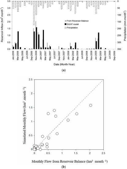 Comparison between measured (from the reservoir balance) and simulated (SWAT) monthly inflows to the Enxoé reservoir (a); and scatterplot of the measured versus simulated monthly inflow values (b) between 2006–2009.