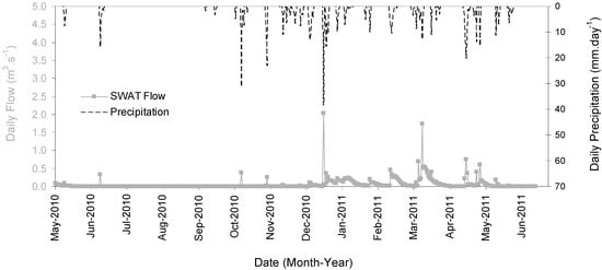 A second explanation could be a lack of nutrient loads being delivered by the surface water. However, the surface water was reduced in these months as a result of lower precipitation and flow peaks (Figure 4). Also, TSS loads (transported by surface water) did not exhibit the same under predictive trend as seen for N and P loads. Nonetheless, the type of fertilization (mineral and organic forms) was also tested in SWAT, but the effect was almost unobservable during January and February 2011 due to the low surface water flows; only in the following months was this effect observed, increasing the estimated load and exceeding the field data.