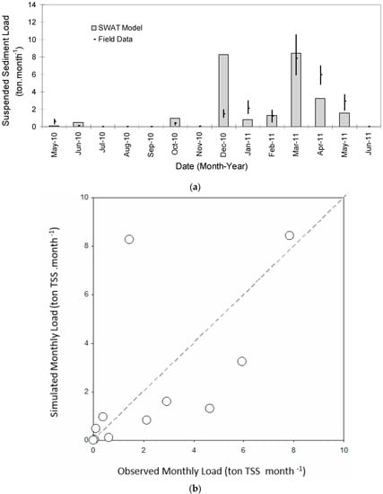 Comparison between the measured and simulated (SWAT) total suspended solids (TSS) loads (a); and scatterplot of the measured versus simulated TSS loads (b) during 2010–2011 (dots denote averages while the segment represents the maximum and minimum monthly load).