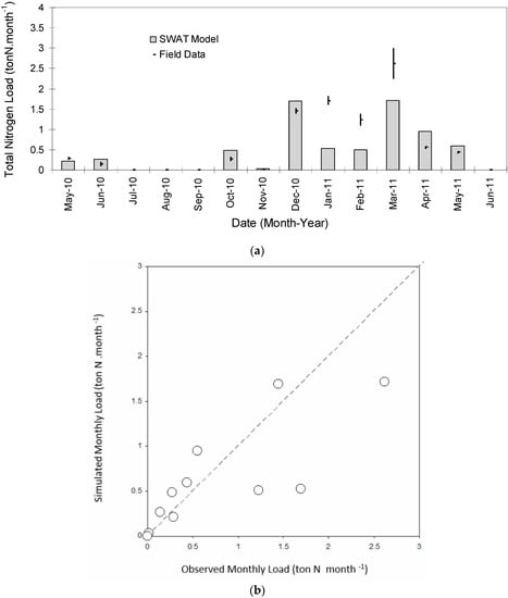 Comparison between the measured and simulated (SWAT) nitrogen loads (a); and scatterplot of the measured versus simulated nitrogen loads (b) during 2010–2011 (dots denote averages while the segment represents the maximum and minimum monthly load).