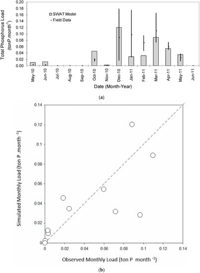 Comparison between the measured and simulated (SWAT) phosphorus loads (a); and scatterplot of the measured versus simulated phosphorus loads (b) during 2010–2011 (dots denote averages while the segment represents the maximum and minimum monthly load).