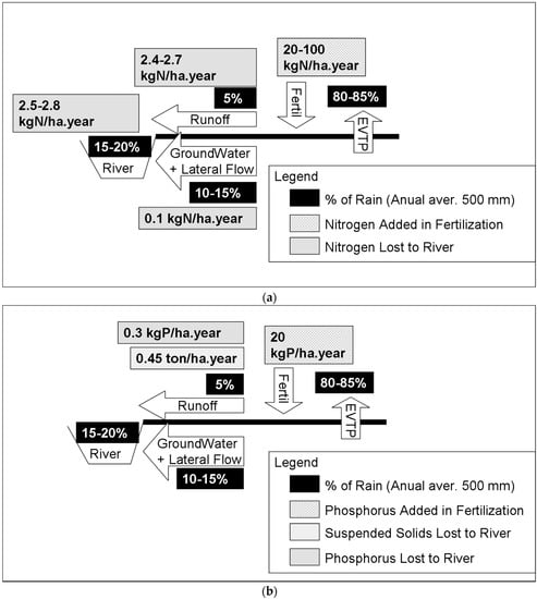 Because of the flushy regime, runoff exports to the river carried 20 times more N (2.4–2.7 kgN ha−1 year−1) than groundwater (0.1 kg ha−1 year−1) (Figure 8). Also, P was mainly transported by runoff because its inorganic forms are normally retained at the soil surface and transported in the particulate form, attached to fine soil particles (erosion). The P export rate was estimated to be 0.3 kg ha−1 year−1 (Figure 8). The nutrient export values in Enxoé were of the same order of magnitude as those obtained by Green and van Griensven [], who reported values of 1–3 kgN ha−1 year−1 and 0.1–0.3 kgP ha−1 year−1 in small sub-basins with corn and wheat in the USA (annual precipitation was less than 890 mm). Alvarez-Cobelas et al. [] also reported values of 0.05–7 kgN ha−1 year−1 and 0.0004–1.6 kgP ha−1 year−1 in three semi-arid sub-catchments with vineyards and forest in Spain (annual precipitation was 400 mm). These authors further concluded that high N exports occurred in areas where agriculture was more nutrient intensive and the annual precipitation was higher, promoting nitrate leaching. For example, Salvia-Castellví et al. [] found nitrate exports of 27–33 kgN ha−1 year−1 in agricultural watersheds with annual precipitation ranging from 700–1200 mm. On the other end, P exports tend to be higher in areas with high erosion and can reach hundreds of kgP ha−1 in a single event, as described in Ramos and Martínez-Casasnovas [,] for a vineyard in northeast Spain.