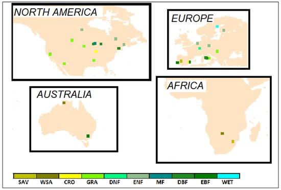 We use in situ observations of latent heat flux and meteorological variables (required to compute PET and identify dry periods, see Section 2.3) from eddy-covariance flux towers. The data were obtained through the Protocol for the Analysis of Land Surface Models (PALS; [32]) and come originally from the FLUXNET LaThuile free fair-use subset (fluxdata.org). Both flux and meteorological data have half-hourly temporal resolution, and we averaged them to a daily time step for this study in order to compare with the model daily data. Days where less than two-thirds of the half-hourly time steps were available for latent flux were neglected. Gap filling and quality control of the meteorological variables were previously conducted by PALS [33]. Figure 1 shows the spatial distribution and vegetation types of the sites used for this study, while Table 1 lists the 35 sites in total with some key information and periods available. The sites chosen each have at least one dry event (as defined in Section 2.3) in the time series and represent a global spread of climate and vegetation types.