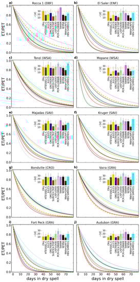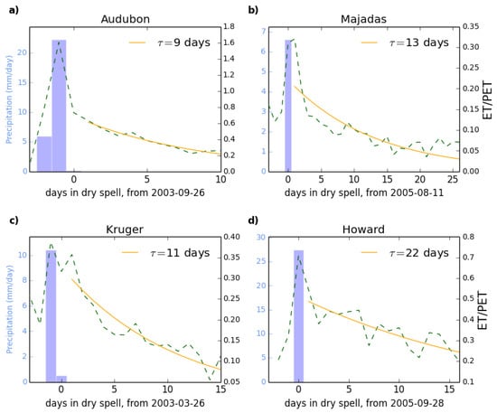 where is the ET ratio at t = 0, and . We define τ (days) as the lifetime of a drydown, a physical parameter with units of time that characterises the drydown as a function of the root system of the site/area and the event evaporative demand from the atmosphere. The τ parameter is independent of the initial ET ratio, and thus independent of the initial state of soil moisture when the precipitation stops. A similar exponential curve has been derived and used previously in other studies using observed and simulated time series of ET, for example, the works of [7,31]. However, we have adopted the use of an ET ratio, helping the identification of water-limited drydowns as those events with an ET ratio below one.